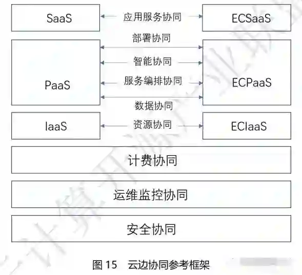 云边协同参考框架主要涉及云计算和边缘计算节点在基础设施、平台、应用三个层面的全面协同, 基础设施层面主要指,IaaS 与ECIaaS 之间需要实现计算、网络、存储等方面的资源协同;平台层面主要指,PaaS 与 ECPaaS 之间需要实现数据协同、智能协同、服务编排协同和部署协同;应用层面主要指,SaaS 与 ECSaaS 之间需