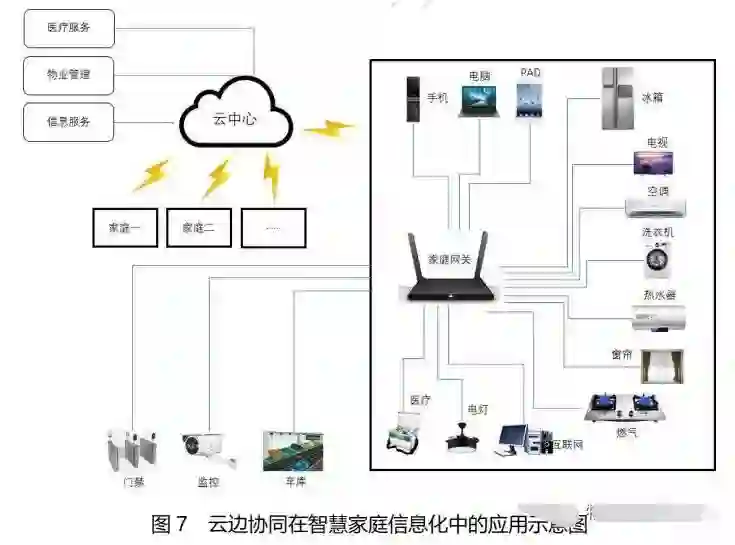 同时,智能家庭云边协同基于虚拟化技术的云服务基础设施,以多样化的家庭终端为载体,通过整合已有业务系统,利用边缘计算节点将包括家用电器、照明控制、多媒体终端、计算机等家庭终端组成家庭局域网。