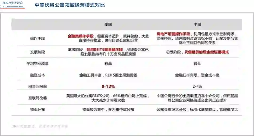 贝壳研究院曾经测算,中国住房租赁市场规模可达3万亿;华兴资本2017年发布的《长租公寓行业报告》则有两个口径,最乐观预期市场规模是5万亿。中国的包租模式没有日本稳定的房价和租金回报率,也并非日本的土地产权私有制模式(日本的个人地主出于避税需求选择建设租赁住宅并长期出租,往往是租赁住宅土地与房源的主要供给者,而中国招拍挂制度下房产开发商集中拿地进行商品房开发销售,缺乏大规模进行租赁用地开发与租赁住宅持有的动力),而与美国的出租公寓市场相比,中国的出租公寓市场既没有低融资成本的优势,也没有多元的金融工具。