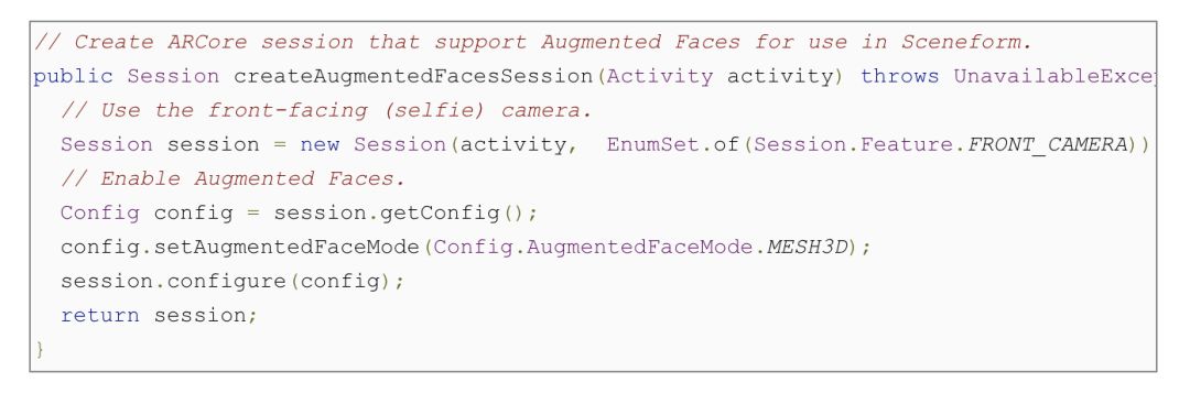 Google 提供 Unity 和 Sceneform 版本的 Augmented Faces 示例程序,你可以从那里开始。只需创建 ARCore Session 的时候,指定 “front-facing camera”和启用 Augmented Faces “mesh” 模式即可。值得注意的是,使用前置摄像头时,其他 AR 功能如平面检测,目前还不支持。