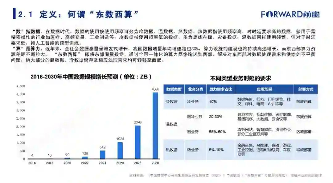 “算”是算力。近年来,全社会数据总量呈爆发式增长,我国数据增量年均增速超过30%,算力设施的建设也将持续高速增长,而东西部算力资源差距不断拉大。“东数西算”即将东部海量数据,通过全国一体化的算力网络输送到西部,解决对东西部对数据处理需求和供给的不平衡问题,绝大部分的温数据、冷数据储存及相应处理需求均可转移至西部。