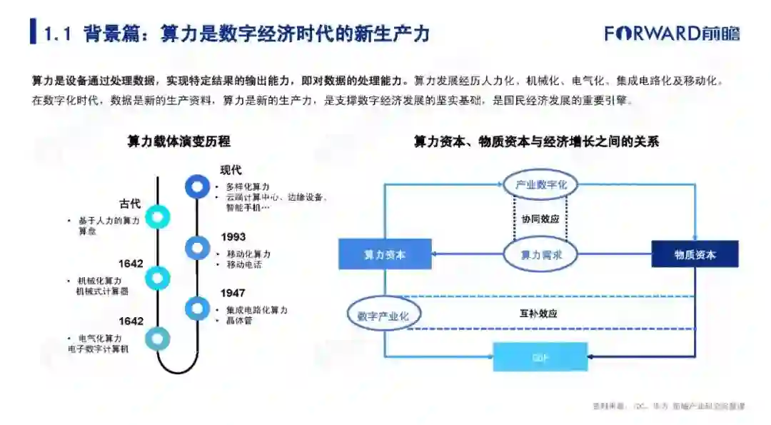 算力是设备通过处理数据,实现特定结果的输出能力,即对数据的处理能力。算力发展经历人力化、机械化、电气化、集成电路化及移动化。在数字化时代,数据是新的生产资料,算力是新的生产力,是支撑数字经济发展的坚实基础,是国民经济发展的重要引擎。