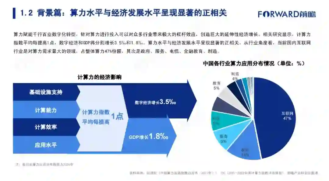 算力赋能千行百业数字化转型,针对算力进行投入可以对众多行业带来极大的杠杆效应,创造巨大的延伸性经济增长。相关研究显示,计算力指数平均每提高1点,数字经济和GDP将分别增长3.5‰和1.8‰。算力水平与经济发展水平呈现显著的正相关。从行业角度看,当前国内互联网行业是对算力需求最大的领域,占整体算力47%份额,其次是政府、服务、电信、金融教育、制造。