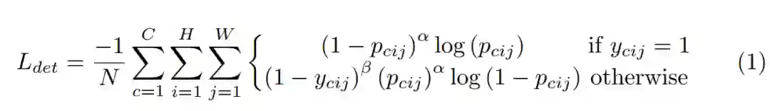 pcij表示类别为c,坐标是(i,j)的预测热点图,ycij表示相应位置的ground-truth,论文提出变体Focal loss表示检测目标的损失函数: