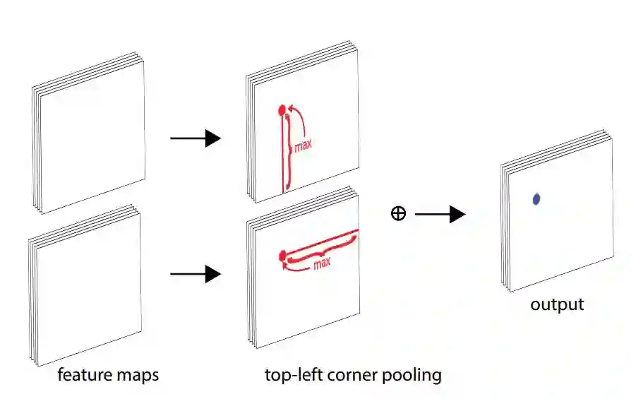 论文第二个创新是提出了corner pooling用于定位顶点。自然界的大部分目标是没有边界框也不会有矩形的顶点,依top-left corner pooling 为例,对每个channel,分别提取特征图的水平和垂直方向的最大值,然后求和。