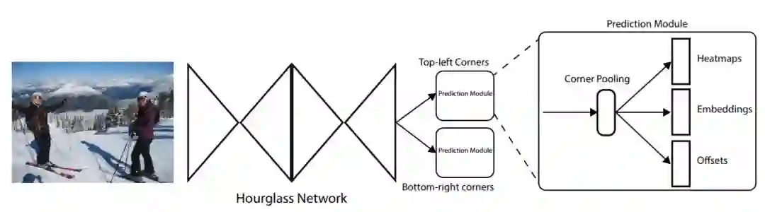 Hourglass Network是人体姿态估计的典型架构,论文堆叠两个Hourglass Network生成Top-left和Bottom-right corners,每一个corners都包括corners Pooling,以及对应的Heatmaps, Embeddings vector和offsets。embedding vector使相同目标的两个顶点(左上角和右下角)距离最短, offsets用于调整生成更加紧密的边界定位框。