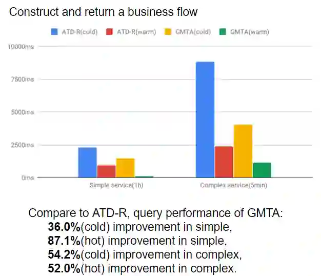 下图展示了生成并且返回Business Flow时,ATD-R和GMTA的性能对比,从结果可以看出,不管是简单规则还是复杂规则,冷查询还是热查询,GMTA相较于ATD-R都有着很大的性能提升,这说明了基于图的存储结构对于查询性能的提升有着明显的帮助。