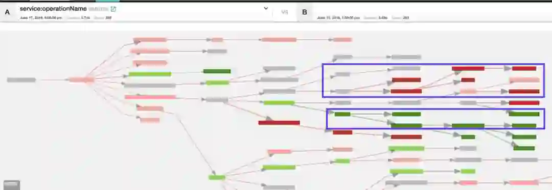 GMTA Explorer提供的另一个功能是错误传播链的对比功能。有时业务不可用了,但是错误指标湮没在了数量巨大的软错误中,导致无法确定故障排查的范围。GMTA Explorer可以对比故障时期和正常时期的错误传播链,展示在故障期间数量异常变化和新增的错误传播链,帮助开发人员或运维人员快速缩小故障排查的范围,提高故障排查的效率。下面这张图中红色字体的错误传播链就是故障时期新增或者数量变化较大的错误传播链。