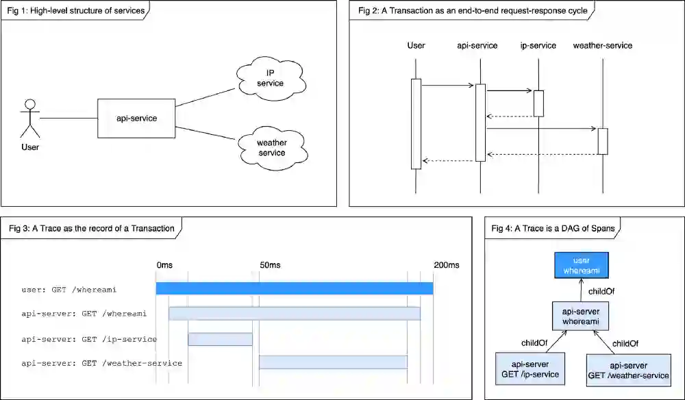 目前流行的开源分布式追踪系统如Zipkin,Jaeger,SkyWalking和PinPoint等大多基于单个Trace进行如下视图的可视化,以用于辅助开发或运维理解依赖关系和定位故障根因等。