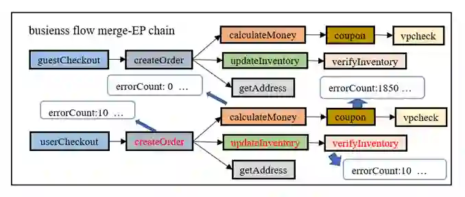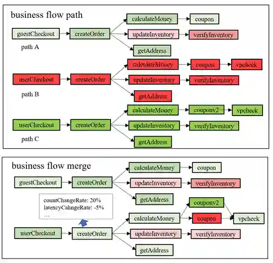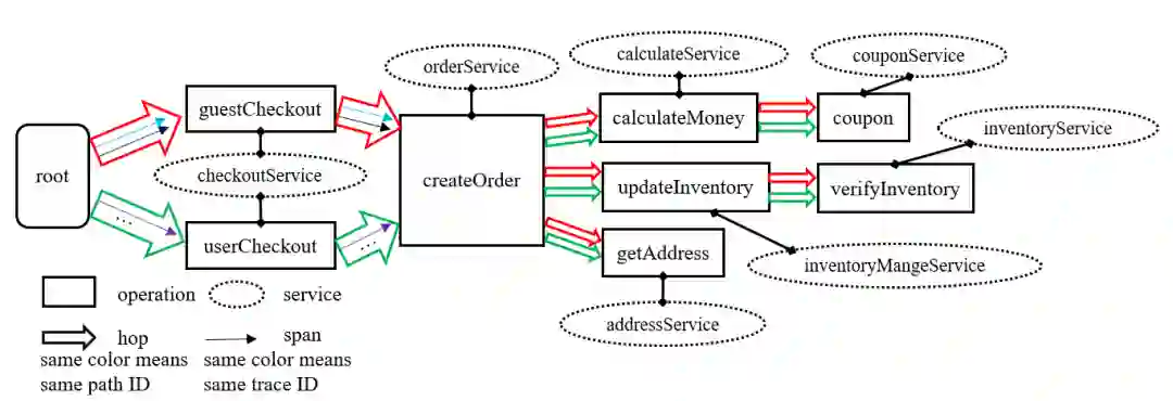 下图中的小箭头代表一个Span,颜色相同的Span代表这些Span有相同的Trace ID,GMTA会先把Trace ID相同的Span拼接为Trace,同时寻找出有错误的Span组成的错误链。然后会把路径完全相同的Trace聚合为一条Path,如图中的蓝色和黑色的两条Trace路径完全相同,被聚合为红色大箭头组成的Path,绿色大箭头组成了另一条Path。两条Path经过的一个Operation不一样。在这个例子中,我们定义的Business Flow筛选规则是经过“createOrder”这个Operation的Path都属于购买场景,所以图中的两条Path被划分为了同一个Business Flow。