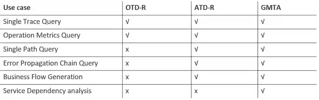 为了解决这些问题,我们提出了GMTA和GMTA Explorer。GMTA采用基于图的思想对Trace数据进行聚合、处理和存储,提供高效的查询接口。GMTA Explorer在GMTA基础上提供了基本可视化视图、对比视图和错误链筛选视图等,难以理解业务、单个trace视图无用和难以定位根因范围等问题。
