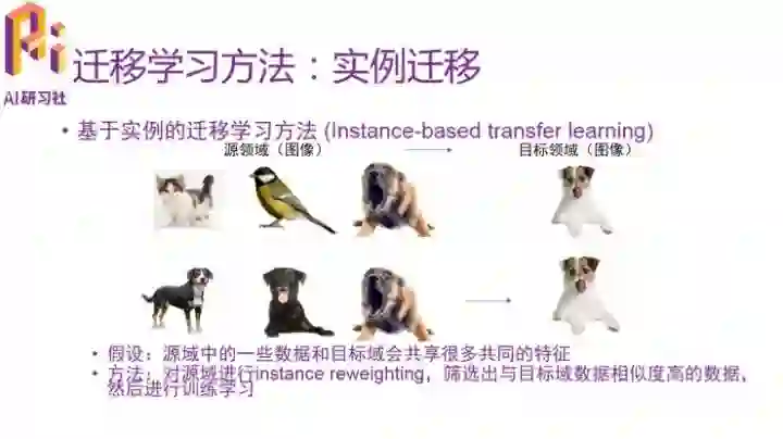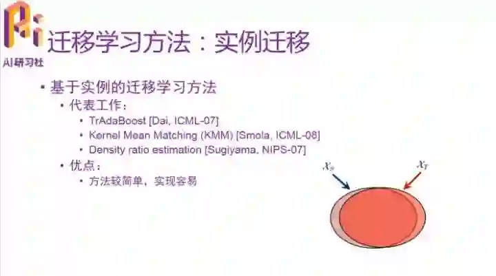 先看基于实例的迁移学习方法。假设是源域中的一些数据和目标域会共享很多共同的特征。方法是对源域进行instance reweighting,筛选出与目标域数据相似度高的数据,然后进行训练学习。