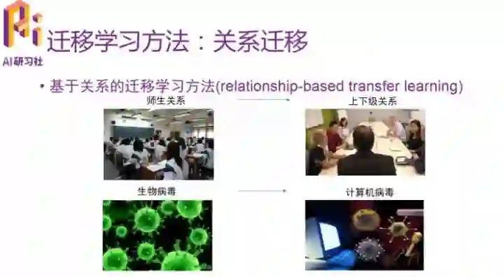 最后是基于关系的迁移学习方法,可以由师生关系类比上下级关系,也可以从生物病毒的传播规律类比计算机病毒的传播。