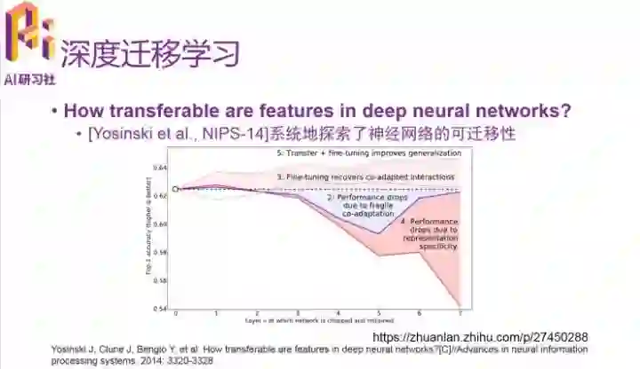 下面看下最近的一些工作,14年有一篇论文探讨了神经网络的可迁移性,横轴是层数,纵轴是精度。