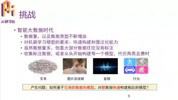 我们先来看一下背景:在智能大数据时代,面对数据量以及数据类型的不断增加,需要能快速构建具有强泛化能力的机器学习模型。大部分数据往往没有标注,收集标注数据或者从头开始构建模型,代价高昂且费时。