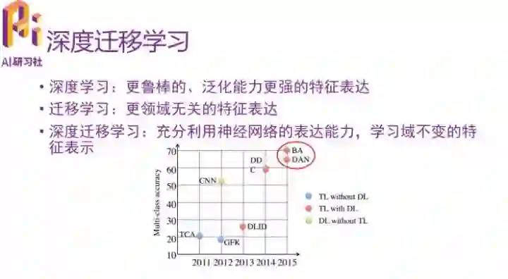 下面来分析深度迁移学习。深度学习可以学习到更鲁棒的、泛化能力更强的特征表达,迁移学习能学习到领域无关的特征表达,这和深度学习不谋而合,将两者结合,能充分利用神经网络的表达能力,学习域不变的特征表示。