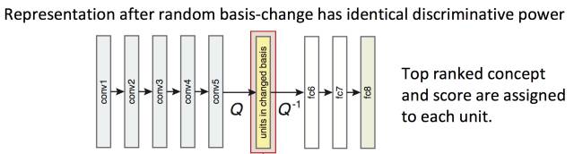 为了探究网络的可解释性(Interpretability)的是否是与units的排列分布有关,作者对于某一层的所有unit进行random linear combination(下图Q),也即打乱该排布方式,而后将打乱的次序归位(下图Q^(-1)),观察concept的变化情况得到结果。具体如下图所示: