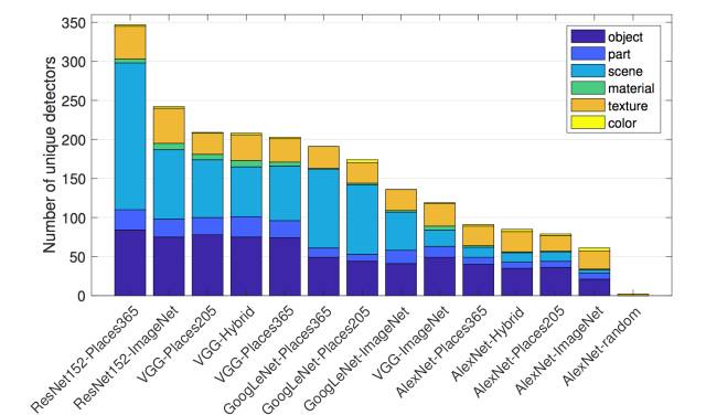 在网络结构实验中,作者将常见的网络结构在不同的数据集上进行训练,从中我们可以发现ResNet152的表达能力最强,而不同的训练集对于同一网络的表达能力也有影响,Places 365更多是场景分类,而且图片数量较ImageNet更多,因此网络会有更多的concept响应单元。