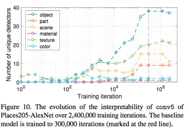 训练过程的探究实验中,我们可以发现,网络在训练初期更容易学习到物体的底层的特征,而到后期,逐渐学习到更为高阶的一些物体特征;而在Fine-tune的实验中,作者也发现,随着finetune的进行,不少的层的concept对应关系也会因为finetune数据集不同而发生对应数据集的迁移转变。