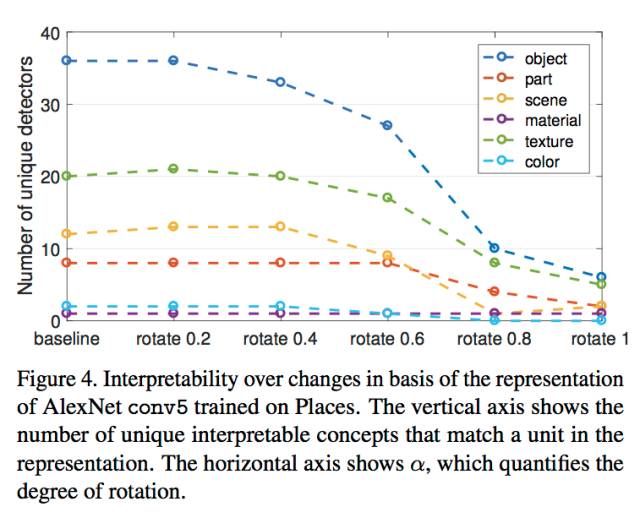 可以从结果中发现,随着rotation的逐渐变大,unique concept unit的数量开始急剧减少,因此CNN网络的可解释性是受到unit的排序的影响的。(写者注,这个结论强依赖于公式(1)的定义,是否是恰当的对于可解释性的描述有待讨论)。
