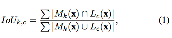 也即,通过计算该层feature map二值化激活区域与不同语义Ground Truth结果的交并比来确定该层所应该属于的语义结果。其中,x代表输入图像,c代表concept(概念),k代表某个单元, Sk(x) 是该单元特征图像feature map A(x)缩放回输入大小后的结果,Mk(x) ≡ Sk(x) ≥ Tk,Mk(x)为大于某个阈值的激活区域。
