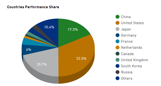 中国以34.6%的比例仍居榜首,美国以29.8%排名第二,日本以6.4%位列第三。