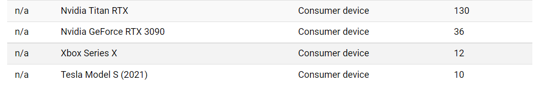 家用游戏主机Xbox Series X,算力为12teraflops。特斯拉的Model S ,算力为 10teraflops。