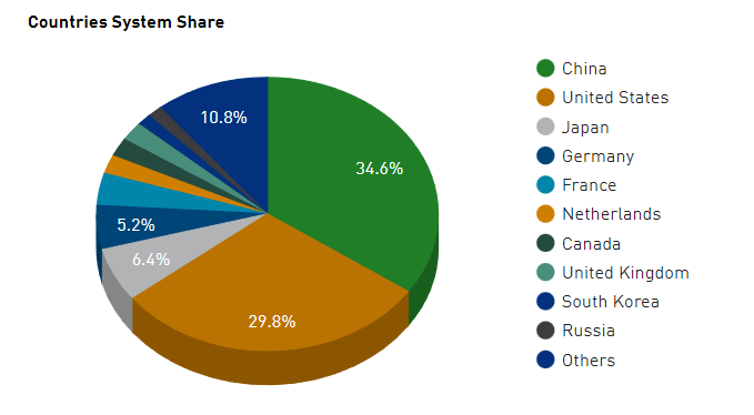 这两个国家的超级计算机总数占 TOP500 超级计算机的近三分之二。