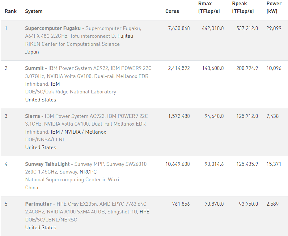 自 2020 年 6 月首次登上榜首以来,日本超算Fugaku(富岳)一直稳坐头名,算力优势明显。
