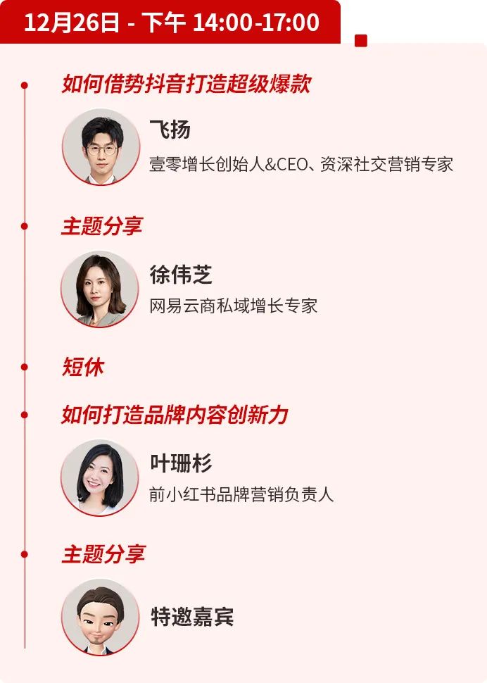 本场大会,我们将话题聚焦在全域营销、私域变现、新品牌、新消费、电商直播、数字化等等行业热点上,邀请嘉宾们带来实战案例&方法论的分享。