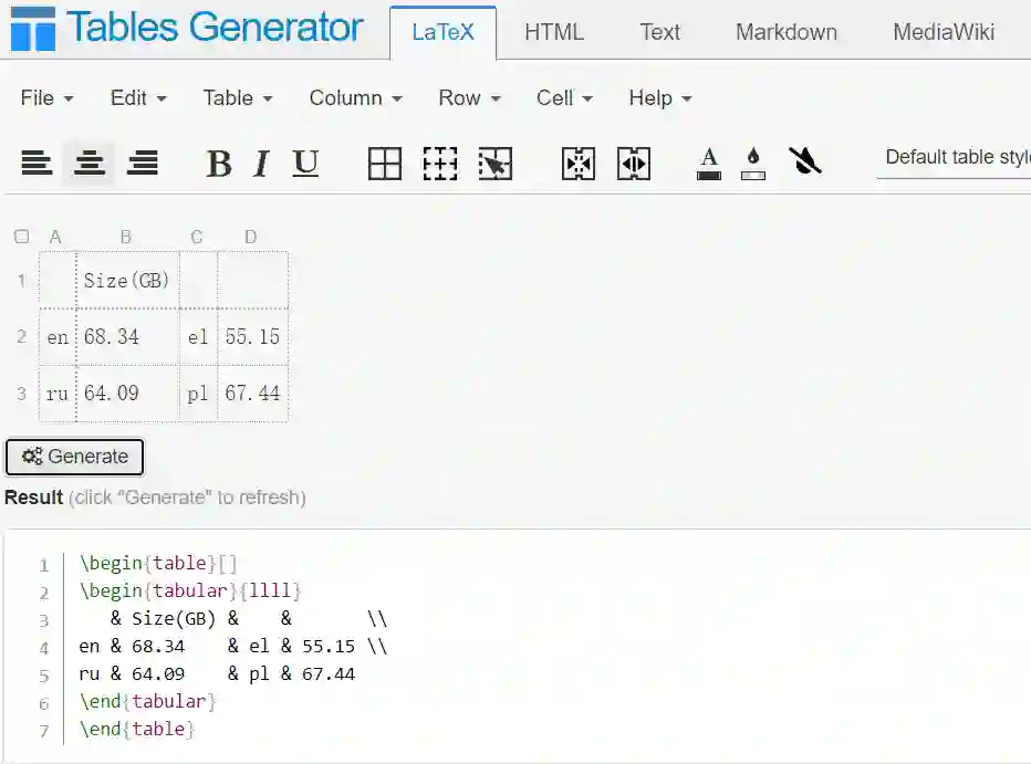 在 demo 中拉出表格,填好数据,generate,就能得到需要的目标语言代码。除了 latex 之外,也支持生成 markdown 和 html 表格代码。