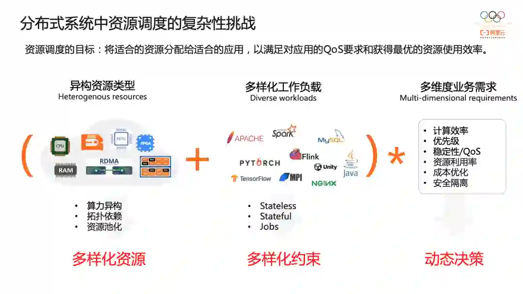 对多样化的工作负载的支持。从Stateless的Web应用、微服务应用,到有状态的中间件和数据应用,再到AI、大数据、HPC等计算任务类应用。他们对资源申请和使用的方式有不同的需求。