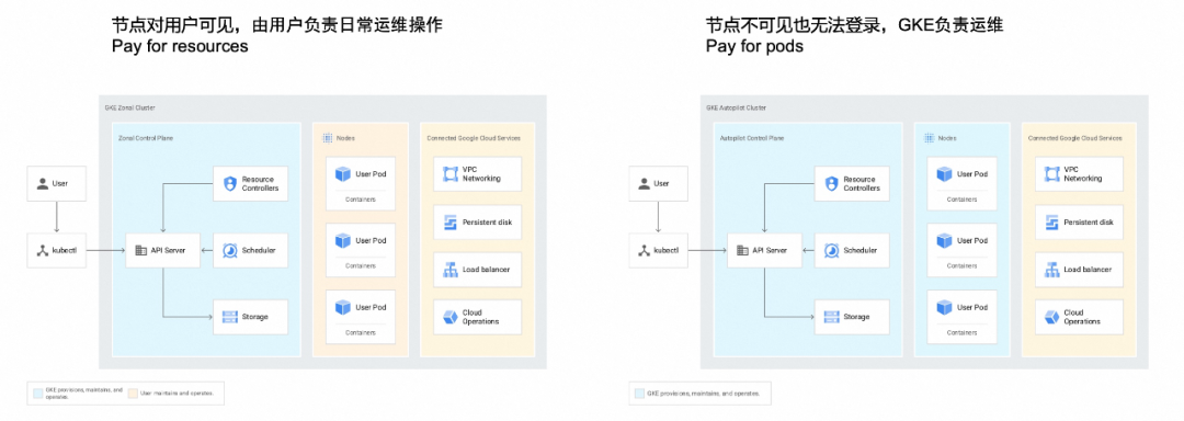 - GKE Autopilot集群节点池/节点对用户不可见,也无法登录进行运维。
