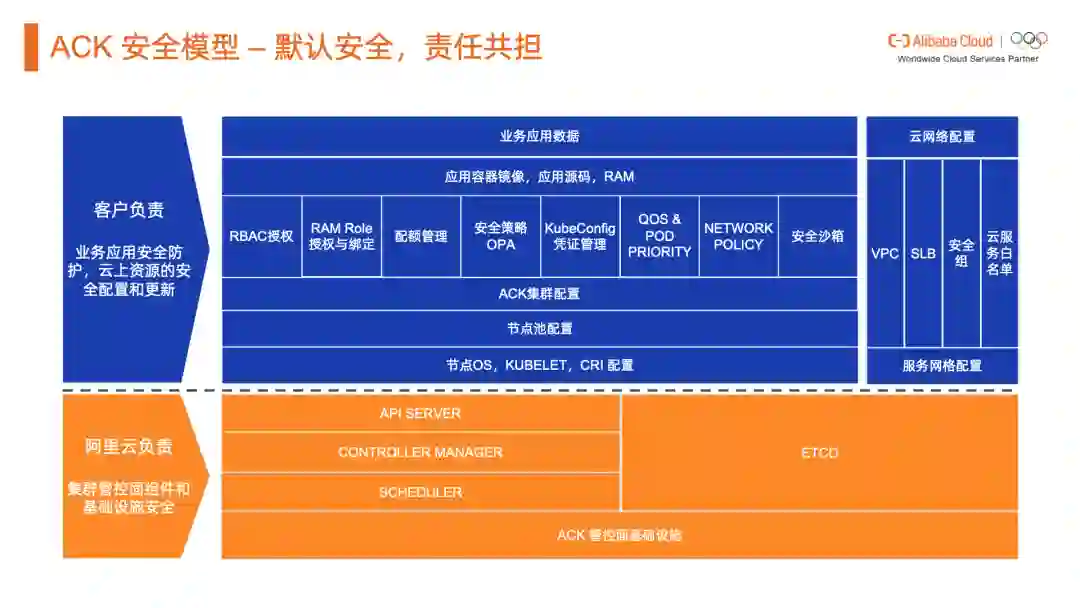 对于K8s数据面的工作节点,可以是ECS VM或者裸金属实例,托管K8s服务只负责节点上 Worker Node 组件的生命周期,其他节点运维依然需要自己负责。这意味着,在运维责任、安全性、稳定性方面,云和客户采用如下图的责任共担模型。