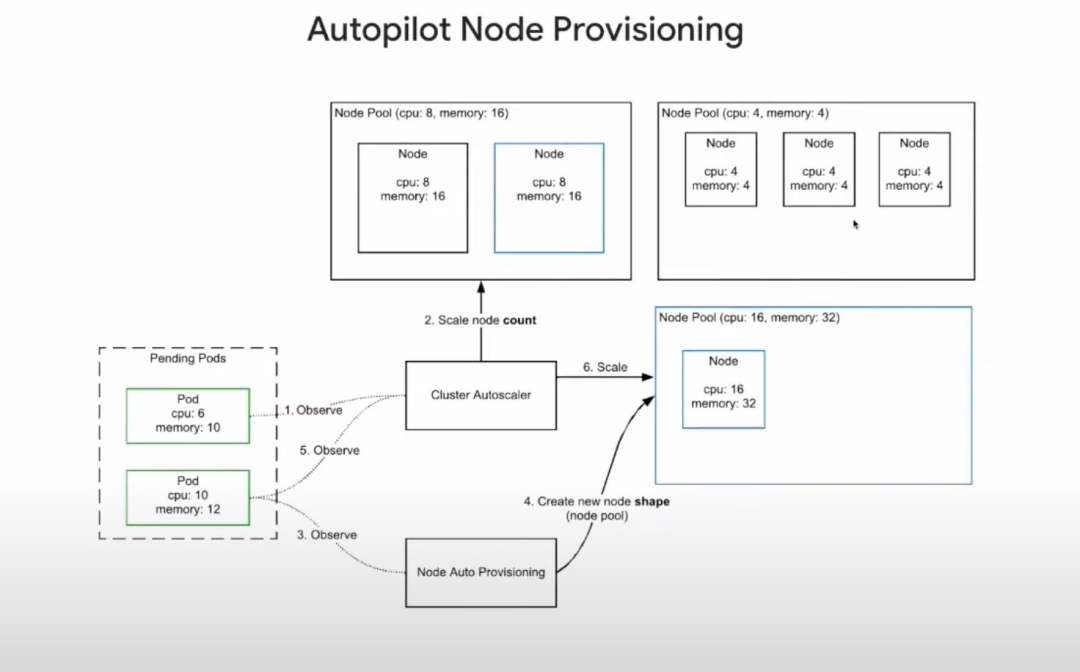 注:GKE Autopilot基于节点池进行伸缩,每个节点池中实例规格保持一致,整个节点创建流程如下图所示。![]()