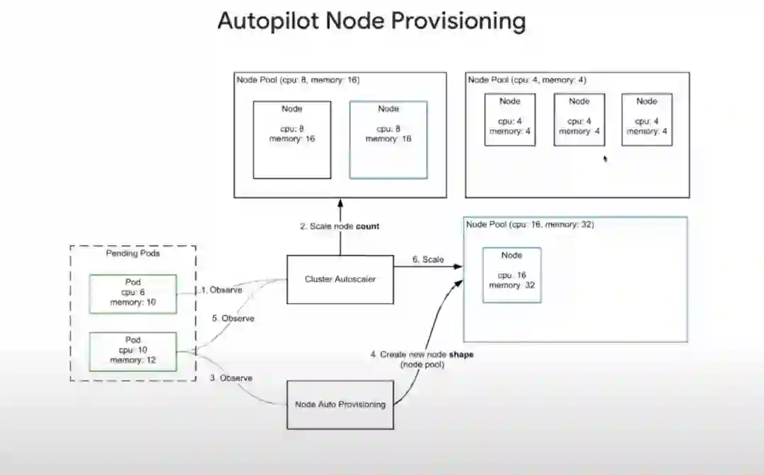 注:GKE Autopilot基于节点池进行伸缩,每个节点池中实例规格保持一致,整个节点创建流程如下图所示。