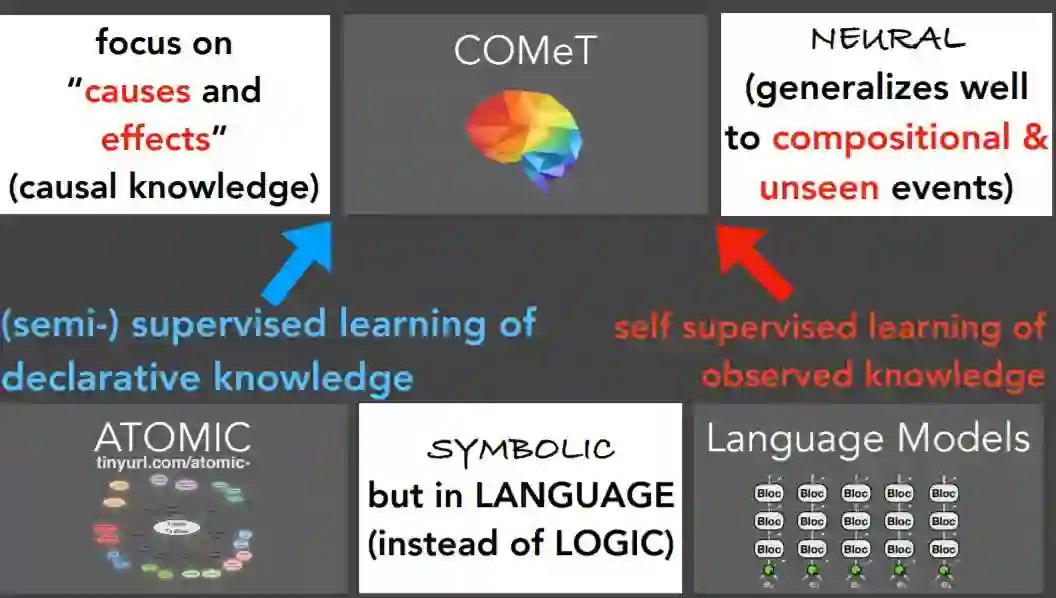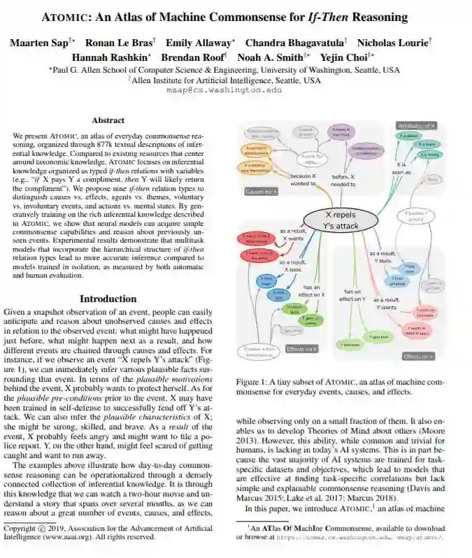 知识图谱为常识性概念的表示提供了一种半结构化的方法。这种结构所提供的视角不同于其他知识来源,比如大规模的文本语料库;然而,要表示何种类型的知识和如何更好的把他们融合到现有的神经网络模型中依旧是一个有待研究的课题。ATOMIC主要关注由if-then这种类型的关系所组成的变量之间的知识推理。作者提出了九种if-then形式的关系类型来区分原因VS结果,代理VS主题,自愿事件VS非自愿事件,行为VS精神状态。基于ATOMIC所描述的丰富的知识推理所生成的训练集,作者证明了神经网络模型可以拥有基本的常识,并对以前未见过的事件进行推理。