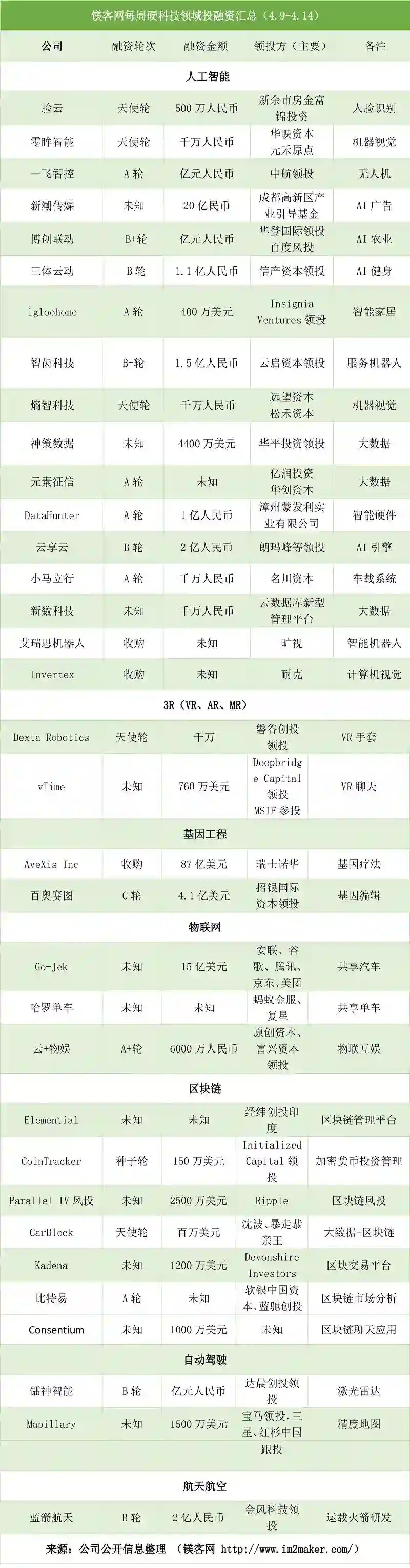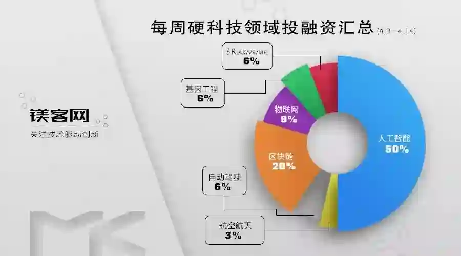 本周硬科技领域投融资事件共34起。其中人工智能事件数量最多,为17起,占比50%。3R(AR/VR/MR)、基因工程和自动驾驶领域投融资事件均为2起,分别占比6%。物联网领域投融资事件3起,占比9%,区块链领域投资事件7起,占比20%。航天航空领域有1起融资事件,占比3%。