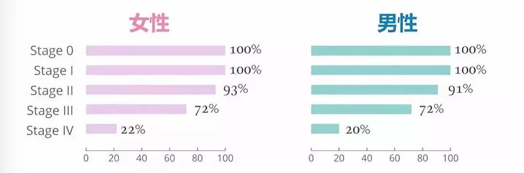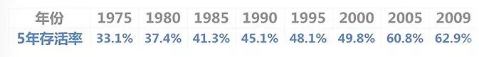 上面这幅图是美国居民五年癌症生存率。虽然不是中国的,但从这幅图我们得出了一个结论: