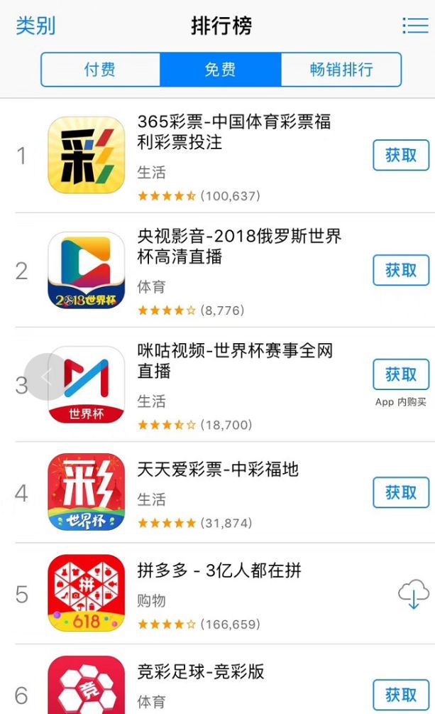 App Store免费排行榜,彩票类在前六位占据半数