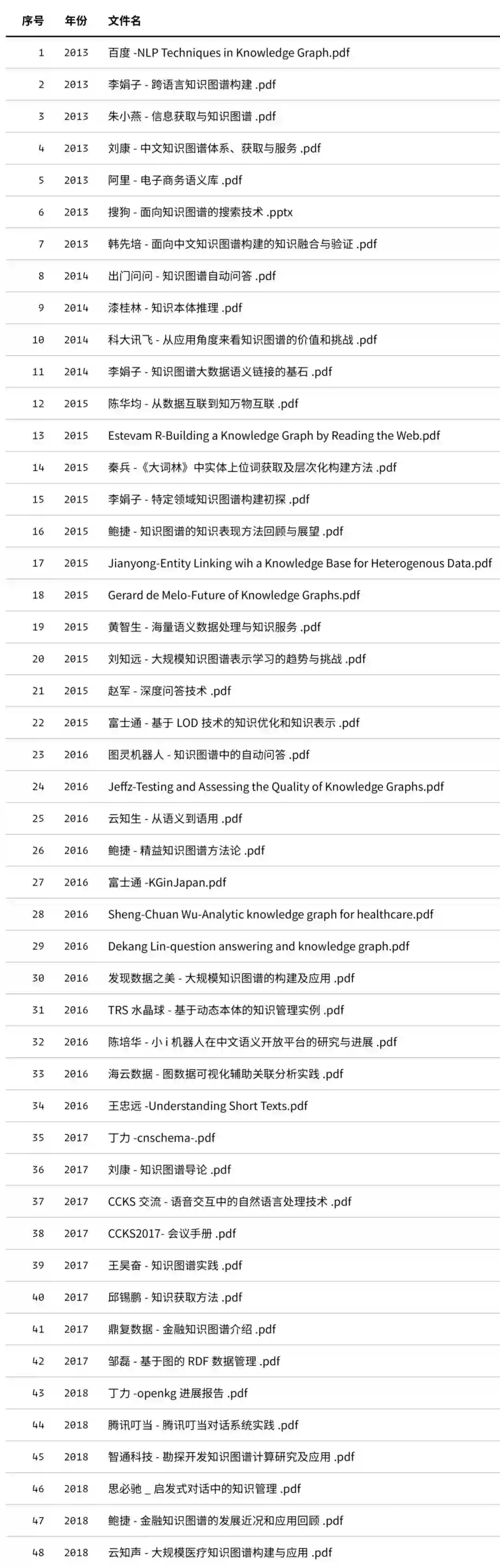 本文汇总了中文知识图谱计算会议CCKS报告合集,涵盖从2013年至2018年,共48篇,从中可以看出从Google 2012年推出知识图谱以来,中国学术界及工业界这6年来知识图谱的主流思想变迁。