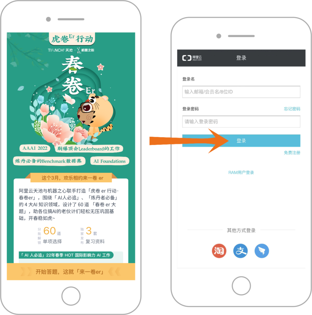 跟随入口引导,使用阿里云账号登录后即可进入活动界面开始答题。
