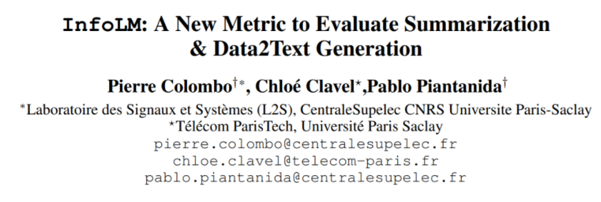 最佳论文8:巴黎 - 萨克雷大学提出了一系列未经训练的指标 InfoLM ,显著改进了文本摘要和 Data2Text 生成任务的许多配置,并获得了超过 10 点的相关增益(Outstanding Student Paper)