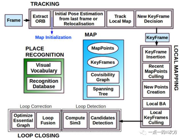 ORB-SLAM主要由三个并发进程组成:跟踪、局部建图和回环检测,下图是论文中给出的系统框图,很直观地展现了各模块的功能和步骤。