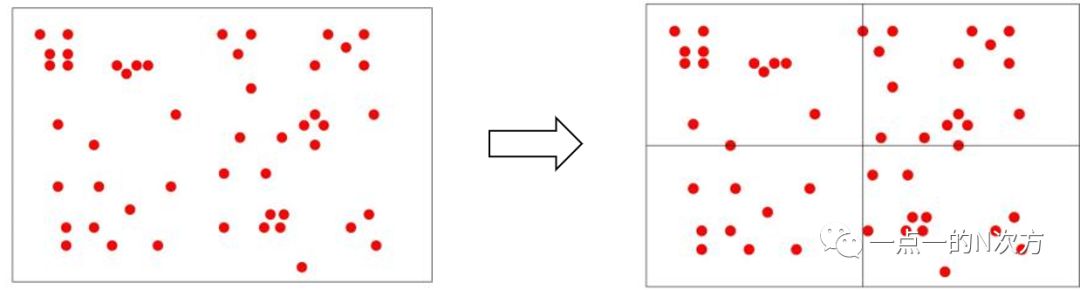 具体怎么实现的呢?这里就用知乎大佬小葡萄所举的例子。我们假设一张图像要提取25个特征点,将图像均匀分为4个节点,只要节点里的特征点数目不等于1或0,抑或节点数目没有超过25,那么就对每个节点继续划分下去。