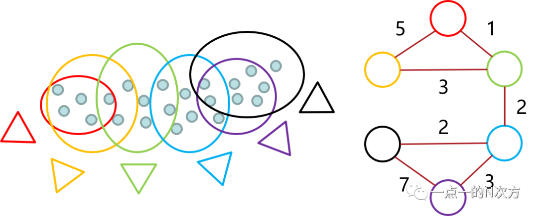 于是就可以得到右边的图结构,红黄之间边的权重为5,红绿权重为1,黄绿权重为3等等。