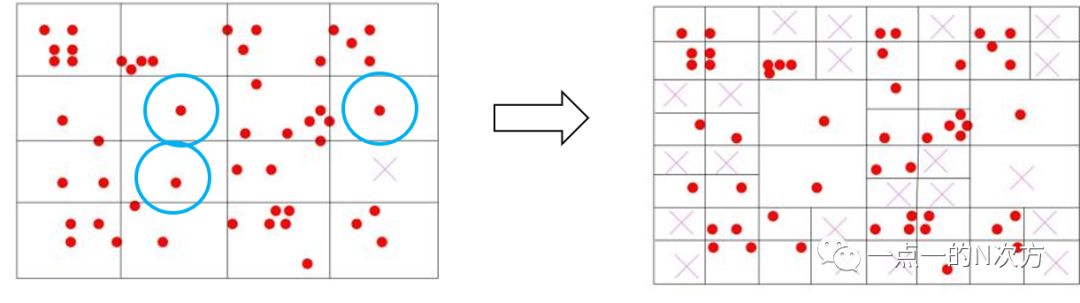 这时3行4列那个节点中没有特征点了,那么就将该节点删除。同时,画蓝圈的三个节点内只剩1个特征点,那么这些节点也不会继续划分下去了。