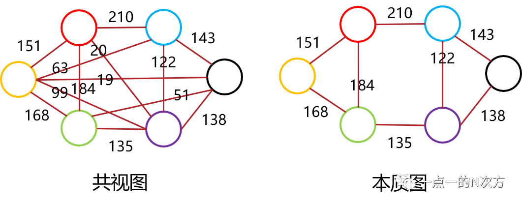 假设有六个关键帧(红黄绿蓝紫黑),对应颜色框里的地图点为各自观测到的点,可以看出红黄两帧共同观测到的地图点个数为5,红绿共同观测到1个,黄绿共视个数为3,以此类推。