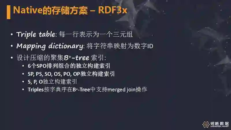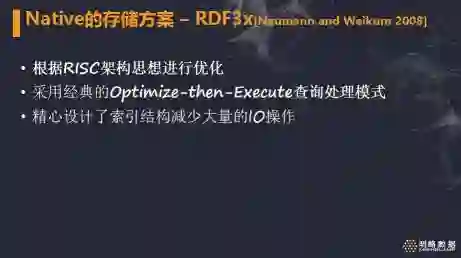 针对这些问题,Weikum 在 08 年提出了基于原生的数据存储格式的 RDF 管理系统,RDF3x。