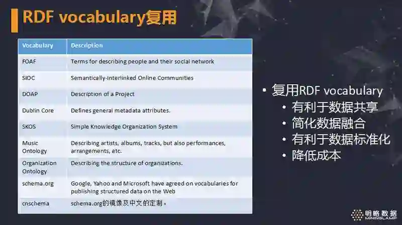 答:对于行业领域,在没有复用数据字典的情况下,要取开发一个全新的 rdf 数据集确实代价比较高。采用 rdf 的好处是开放共享,有标准的访问接口,进而能够支持像推理和挖掘分析这样的应用。